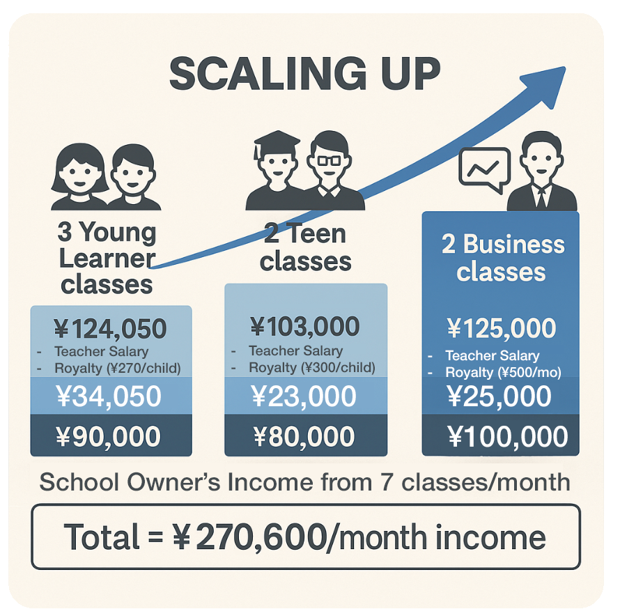 Each 5-student class generates between Β₯30,000βΒ₯51,000 net income per month depending on learner type (Young Learners, Teens, or Business Learners). Owners focus on enrollment and management, while teachers deliver the lessons online.